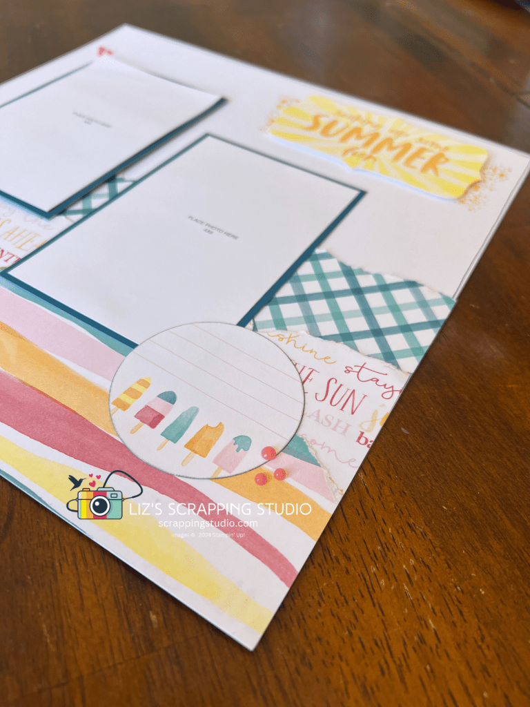 This first sketch is based off a card sketch that was in the SU Annual Catalog. I created a 2 page 12×12 layout from that sketch and then took the CTMH Gnomes for Summer paper and sticker sheet to create this fun summer layout.