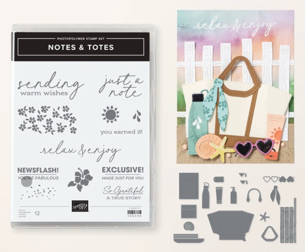 My July kit is a fresh, beachy delight— updating to feature the charming Notes & Totes stamp and die set (sand dollars have sold out).